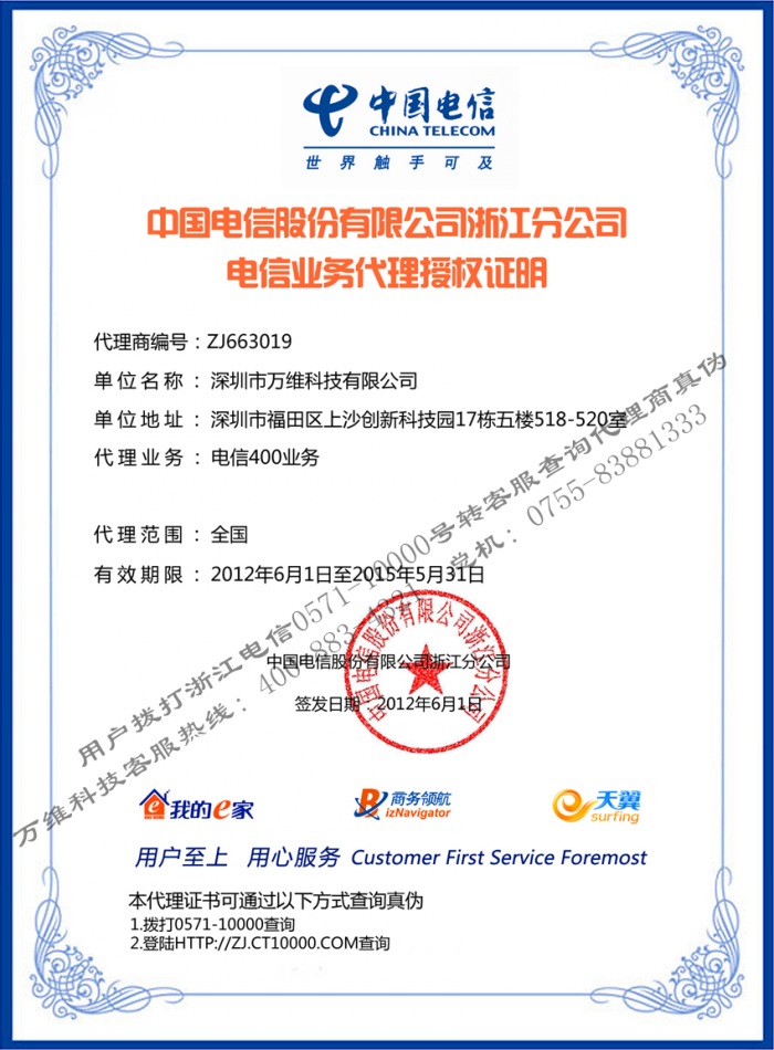 『 用户拨打浙江电信 0571-10000号转人工客服可查询代理商真伪』