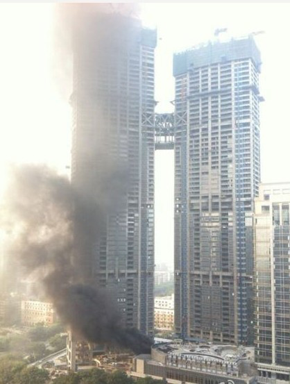 今日下午(2011-12-23)深圳福田竹子林招商银行大厦附近某大厦不明原因起火,刹时间滚滚浓烟从大厦楼层窗户飘来,起火原因有待工作人员调查,以下图为市民手机拍摄: